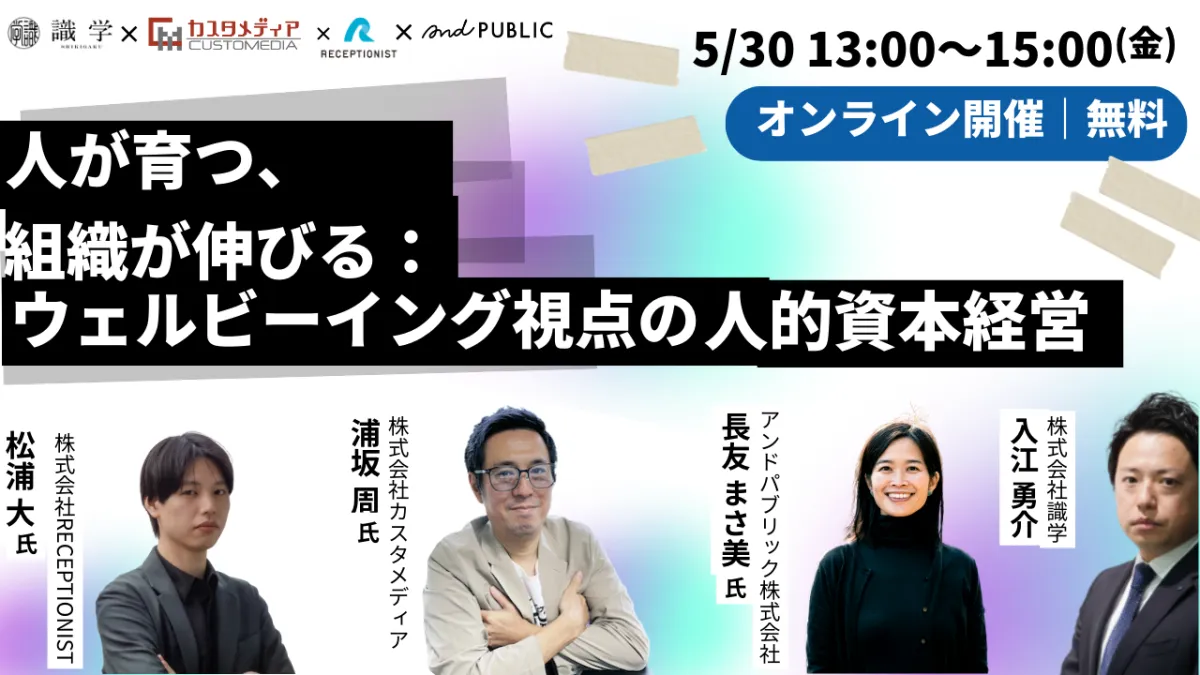 2025年5月30日、株式会社カスタメディアが無料ウェビナー『人が育つ、組織が伸びる:ウェルビーイング視点の人的資本経営』を開催します。このウェビナーは、株式会社識学、アンドパブリック株式会社、株式会社RECEPTIONISTとの共同開催となっており、現代社会における人的資本経営の重要性を探る内容になります。