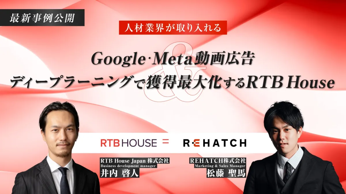 REHATCH株式会社は、RTB House Japan株式会社と共催で、オンラインセミナー「【最新事例公開】人材業界が取り入れるGoogle・Meta動画広告&ディープラーニングで獲得を最大化するRTB House」を開催します。本セミナーでは、人材業界におけるマーケティングや事業推進に携わる皆様に向けて、成功事例の数々を紹介します。