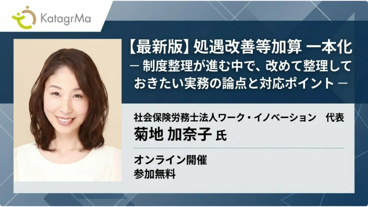 2026年2月19日と20日、株式会社カタグルマが主催するオンラインセミナーが開催されます。このセミナーでは、特定社会保険労務士である菊地加奈子氏が講師となり、保育業界が直面している「処遇改善等加算の一本化」の最新情報や実務の論点について詳しく説明します。