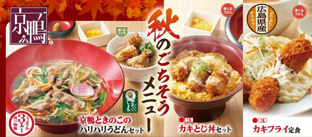 大阪を拠点に展開する人気うどんチェーン「得得」では、2025年9月17日(水)から11月30日(日)までの期間限定で、秋の味わいを楽しめる新メニューを発表しました。この季節特有の食材を使った料理が揃い、お客様にとって特別な味覚体験をお届けします。具体的には「京鴨ときのこのハリハリうどんセット」や「カキフライ定食」などがラインナップされています。