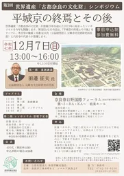 今回のシンポジウムは第3回目となり、テーマは『平城京の終焉とその後』です。考古学の権威であり、公益財団法人元興寺文化財研究所の所長を務める田邉征夫氏が基調講演を行います。彼の専門的な視点から、平城京の歴史的な背景が紹介されることでしょう。