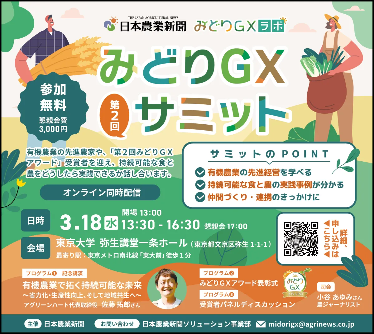 2026年3月18日、水曜日、東京都文京区の東京大学・弥生講堂にて、「第2回みどりGXサミット」が行われます。主催は日本農業新聞(東京都台東区)で、持続可能な食と農の実現を目指すコンソーシアム「みどりGXラボ」の会員交流イベントとして位置づけられています。このサミットには、気候変動への対応や環境に配慮した農業に関心を持つ農家、JA、消費者、自治体、企業、研究者など、幅広い分野からの参加者が集まります。