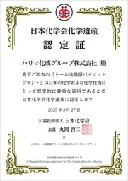 兵庫県加古川市に位置するハリマ化成グループ株式会社のトール油精留プラントが、日本化学会の第16回「化学遺産」に認定されました。この認定は、日本の化学技術の発展に寄与した重要な歴史資料を後世に残すことを目的としています。