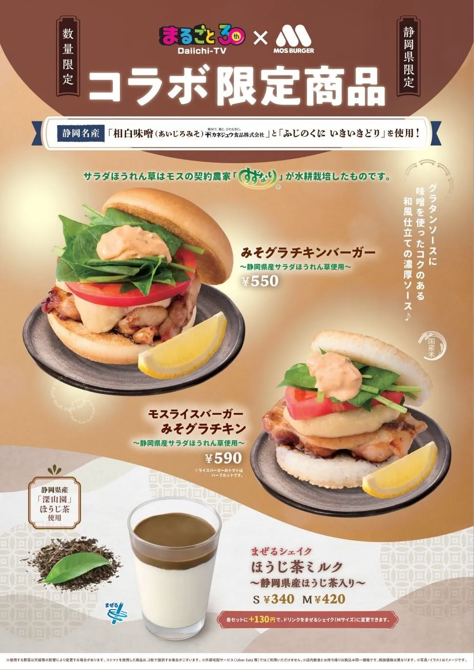 モスバーガーを展開する株式会社モスフードサービスは、2025年2月20日(木)から静岡県内の全38店舗で新作商品「みそグラチキンバーガー ~静岡県産サラダほうれん草使用~」を数量限定で発売します。この新商品は、静岡第一テレビの番組『まるごと』とのコラボレーションによって誕生した、地域の特産品を生かした美味しさが詰まったメニューです。さらに「モスライスバーガー みそグラチキン」と「まぜるシェイク ほうじ茶ミルク」も同時に発売されます。