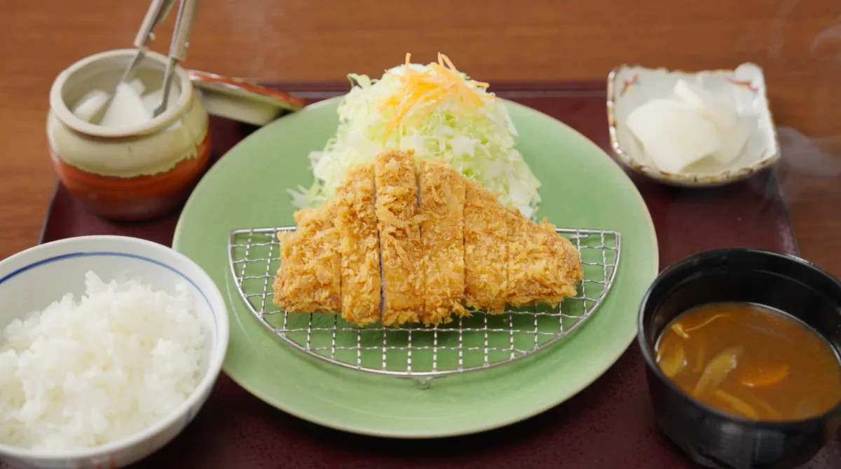 名古屋の名物・味噌だれとたっぷりのねぎをトッピングしたロースかつは、食欲をそそる一品。もちろん、ごはんやキャベツもお替わり自由です。