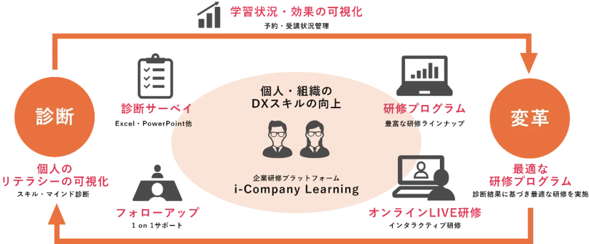 『i-Company Learning』には、個人が主体的に学び成長する組織を意味しています。スキルアップやキャリア開発を通じて企業全体の生産性を高め、持続可能な成長を実現することが目標です。
