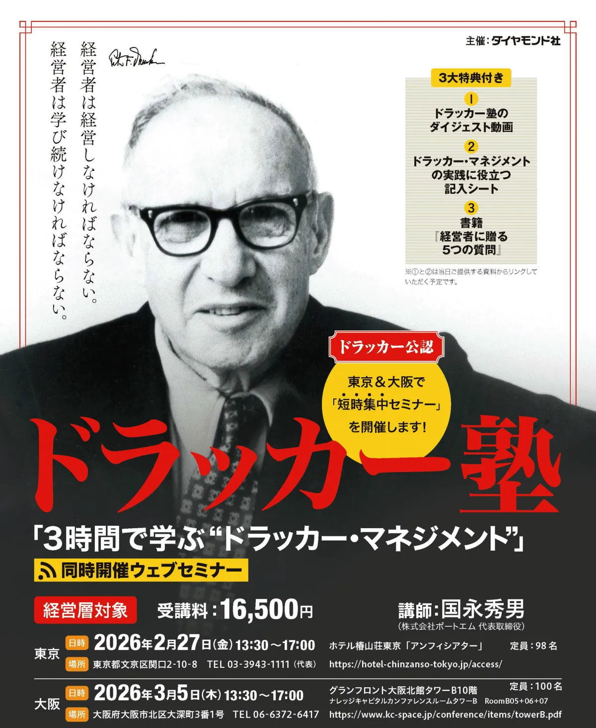 経営者やエグゼクティブ向けの集中セミナー「3時間で学ぶ“ドラッカー・マネジメント”」が2026年の冬、東京と大阪で開催されます。このセミナーは、経営の巨匠であるピーター・ドラッカーの考え方を取り入れた内容で、参加者が実践的に学びを深めることができる貴重な機会です。