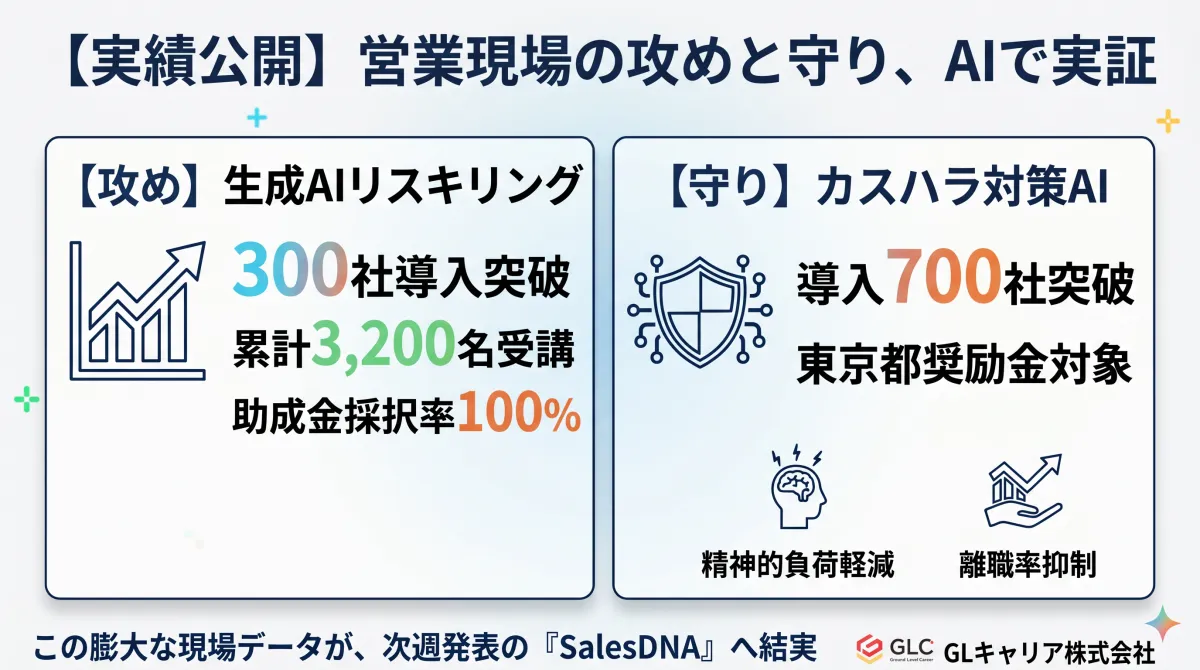 GLキャリアが推進する「攻め」と「守り」の融合は、次世代の営業DXを象徴する取り組みです。「AIリスキリングによる攻めの生産性向上」と、「AI活用による守りの防衛体制」は、営業現場での行動ログと改善指標を創出し、ビジネスの進化を促進しています。