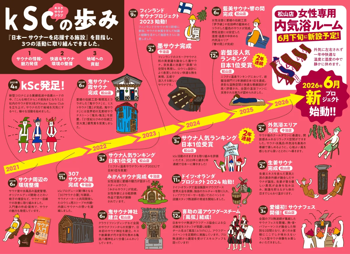愛媛県に拠点を置くキスケ株式会社が運営する「kSc(Kisuke Sauna Club)」は、「日本一サウナーを応援する施設」を標榜し、地域に根ざしたサウナ文化の発展を目指して歩んできました。2021年の発足以降、情報発信、快適なサウナ環境の整備、地域市場への貢献という三つの柱を軸に、様々な取り組みを進めています。2026年6月にはさらなる挑戦が待ち受けているという。