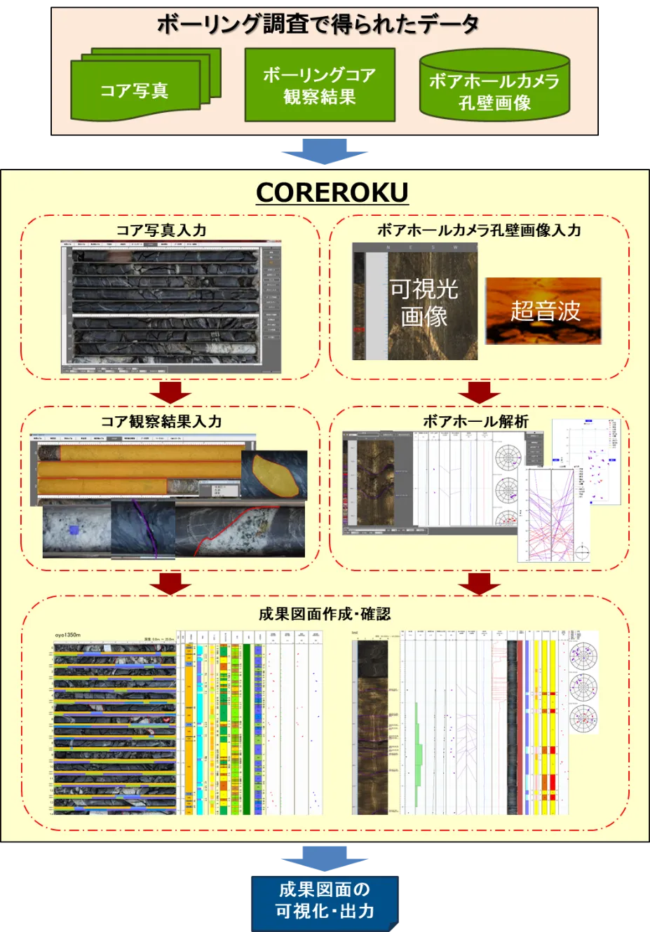 COREROKUは、地質調査において必要とされるデータを単一のツールで管理できるように設計されています。これまで、地質データの処理には複数の異なるソフトを使用する必要があり、作業の効率が損なわれがちでしたが、COREROKUを用いることで、情報の記録や可視化が一元化され、技術者は解析作業に集中できるようになります。このような機能が、技術者の負担を軽減し、結果として作業全体の効率化を実現します。