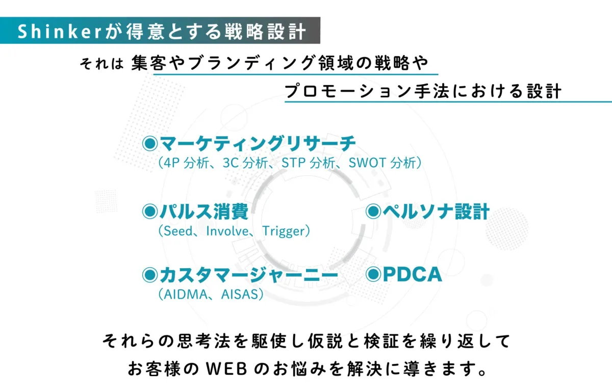 Shinkerは、マーケティング戦略を提案するだけにとどまらず、実行支援にも力を入れています。具体的には、単なる提案を超えて、クライアントと共に成果を実現し、継続的な改善に取り組んでいます。データに基づいた仮説を立て、検証を行うことで、効果的な施策を見出すことができます。