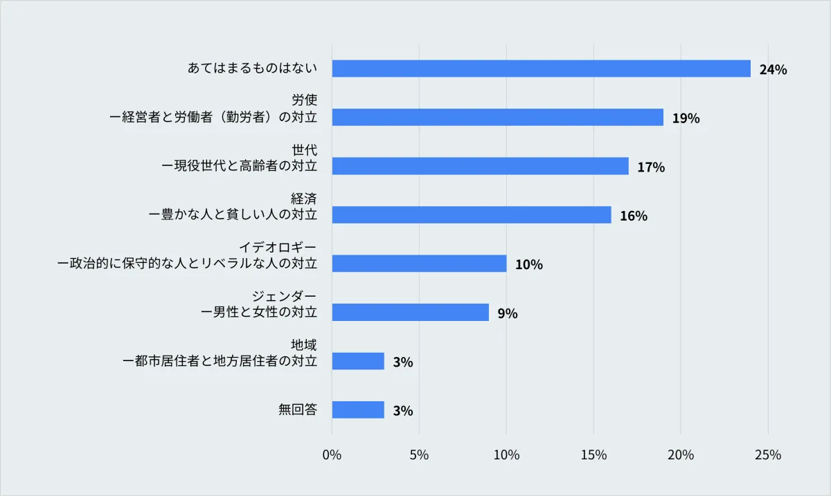 また、甘くない社会的対立の中で、多くの人が自身の立場を意識していることが特徴的です。実際に「当事者として意識している対立」では、経営者と労働者、現役世代と高齢者という結果が出ています。