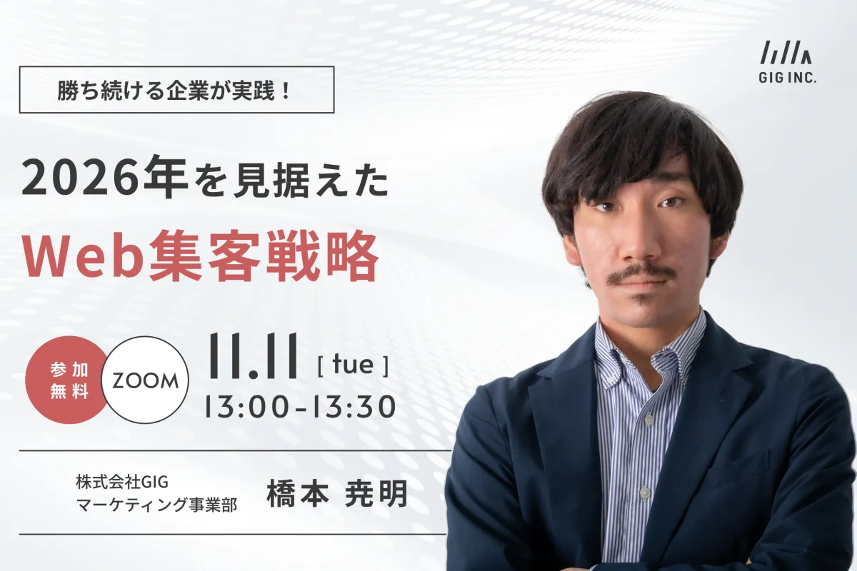 11月11日(火)に開催されるウェビナー「勝ち続ける企業が実践!2026年を見据えたWeb集客戦略」では、これからのWeb集客において企業が注力すべき施策を余すところなく解説します。