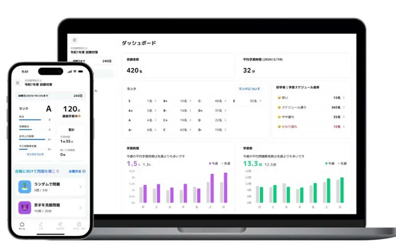さらに、管理者にとっても便利な機能が充実。アプリには管理画面が用意されており、全ての受講生の学習進捗や得意・不得意分野が一目でわかる設計になっています。この機能により、進捗が遅れている受講生へのフォローがスムーズに行えるため、効果的な学習環境を提供できます。