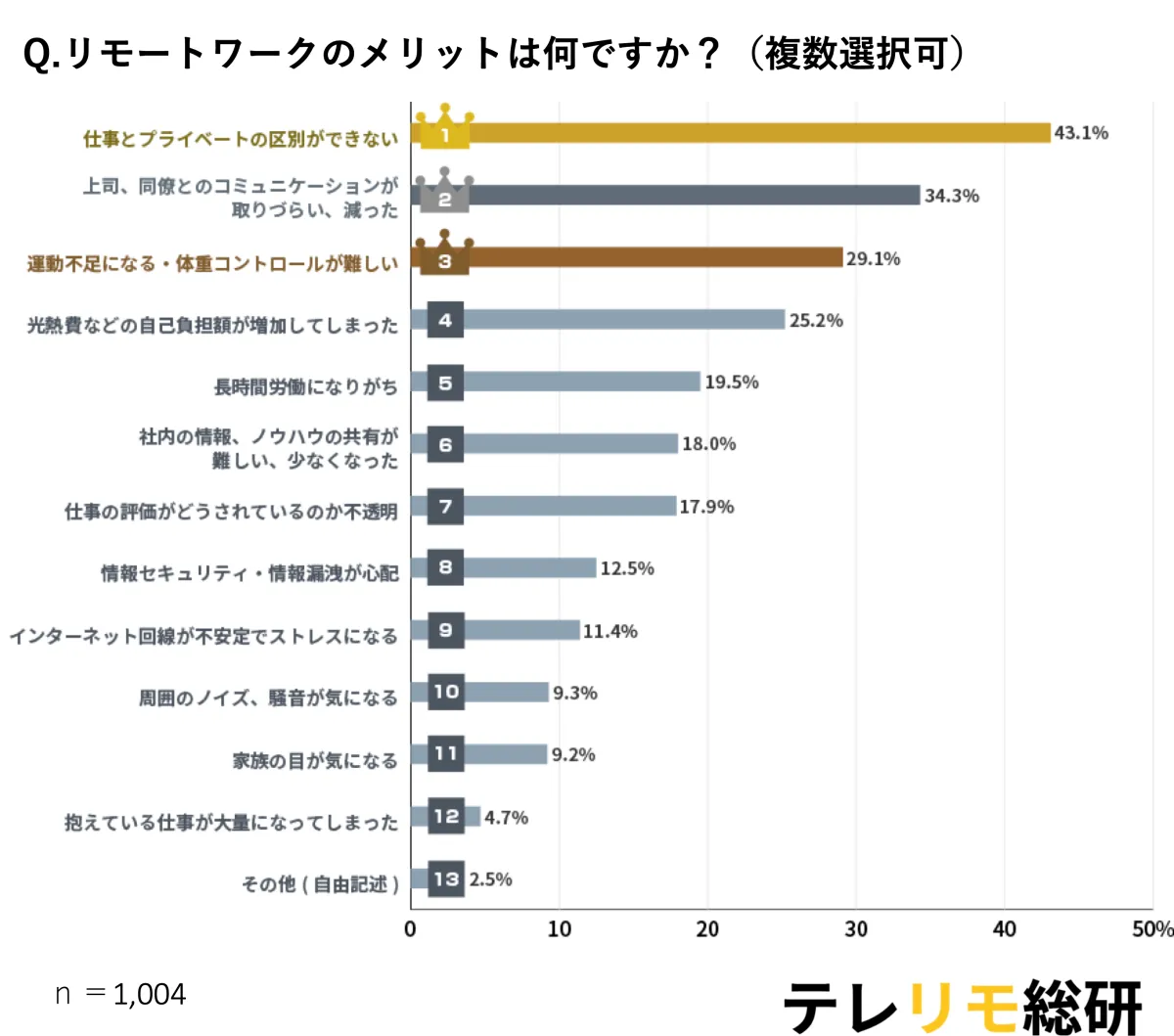 デメリットに関しても興味深い変化が見られました。最も多く挙げられたのは「仕事とプライベートの区別ができない」という点で、今年は43.1%と4ポイント上昇しました。また、運動不足や体重管理の難しさが新たに問題視され、長時間労働が増加する傾向も見られました。特にリモートワーク期間が長引く中で、これらの課題が積み重なっているようです。