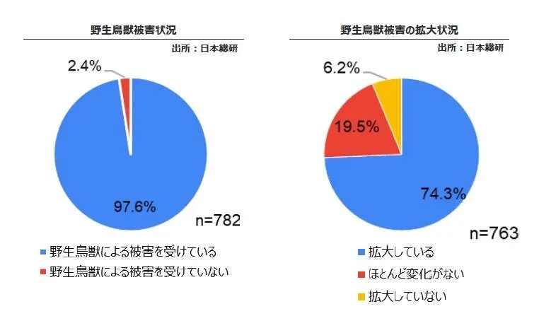 調査の結果、97.6%の基礎自治体が何らかの形で野生鳥獣被害を受けていると回答しました。その中でも、74.3%の自治体が被害状況が「拡大している」ことを明言しており、全国的に被害が深刻化していることが分かりました。