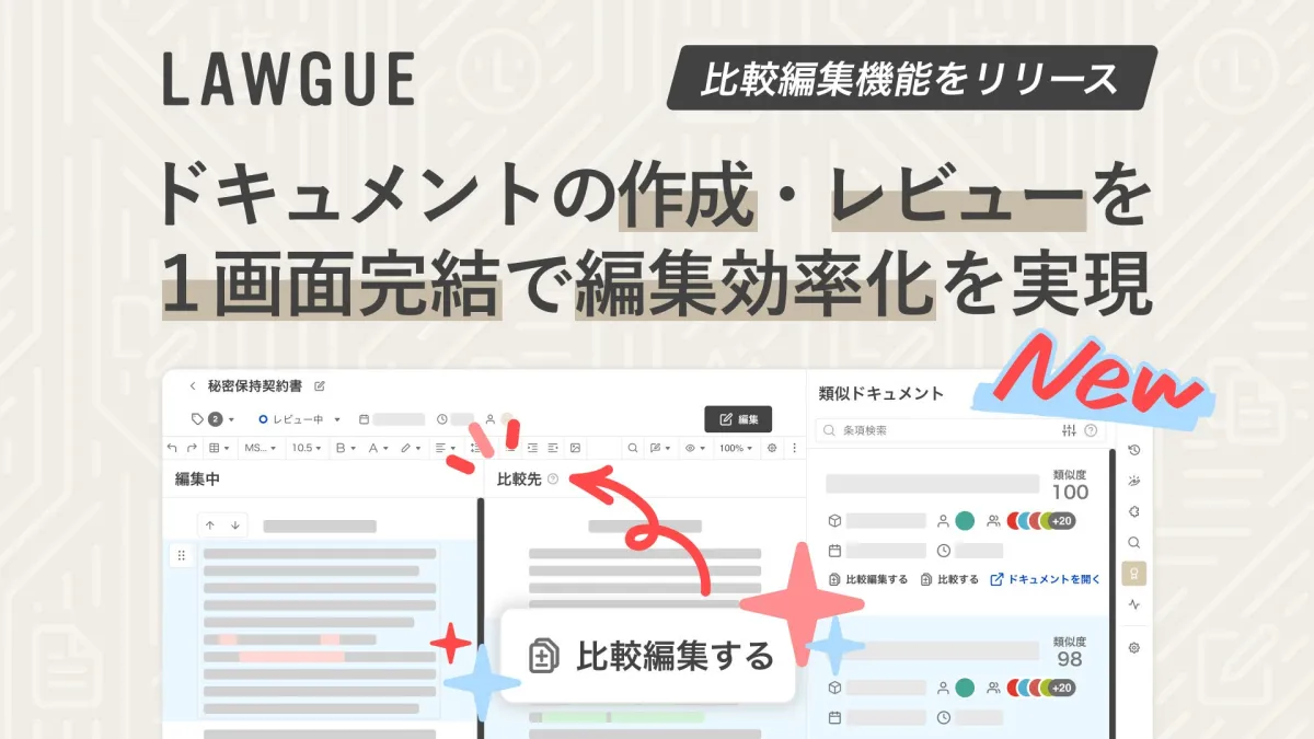 この新機能は、単なる文書比較だけでなく、コメントの確認や特定の条項の検索結果にリアルタイムでアクセスできる点でも優れています。また、以前から利用されていた「マッチング比較」という名称は、従来の比較機能に改名され、今後も引き続き利用可能です。