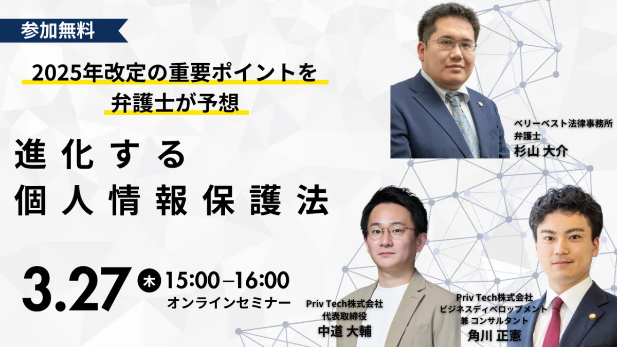 このウェビナーでは、ベリーベスト法律事務所から弁護士・杉山大介氏、Priv Tech株式会社から代表取締役の中道大輔氏とビジネスディベロップメント兼コンサルタントの角川正憲氏が登壇し、個人情報保護法の最新の改正ポイントについて詳しく解説します。個人情報保護法は3年ごとに見直され、その改正内容を適切に把握し対応することが、企業の信頼性向上やリスク回避において極めて重要です。