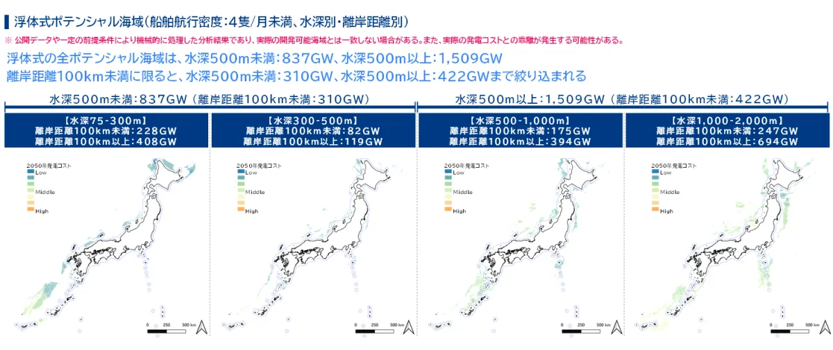 着床式のポテンシャル海域面積は62GW、浮体式は2,347GWと推計され、前回の分析結果とほぼ同様の規模です。水深と離岸距離を考慮した詳細な分析も行われました。特に、浮体式のポテンシャルは、500m未満が837GW、500m以上が1,509GWと報告されています。