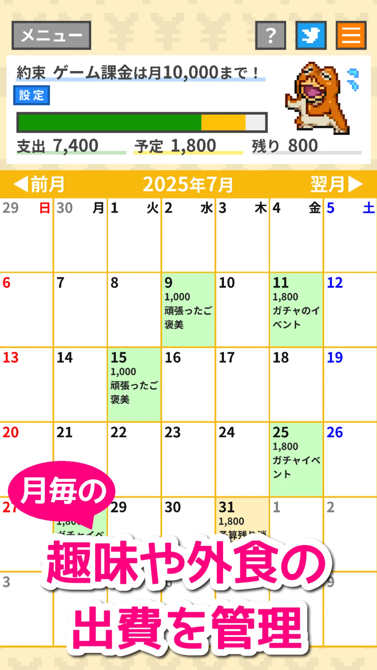 『月ごと浪費ストッパー ガマちゃん』は、月ごとの支出予算を設定し、外食や趣味、さらにはスマホゲームの課金といった「制限したい項目」を管理することができるカレンダー形式の支出管理アプリです。シンプルな入力操作で、ドット絵の可愛らしいキャラクター「ガマちゃん」とのアニメーションを通じて、視覚的に支出状況を把握することができます。