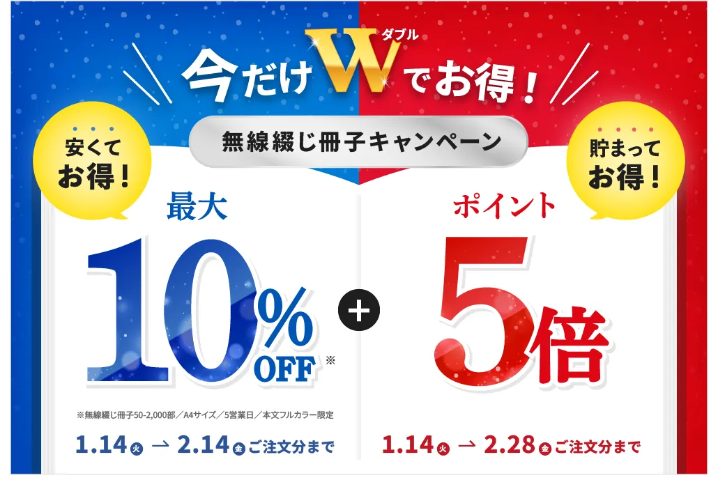 このキャンペーンには2つの要素があり、第一弾は「無線綴じ冊子 最大10%OFFキャンペーン」です。この特典は、2025年1月14日から2月14日までの期間中に、50部から2000部のA4サイズ、36ページから508ページのフルカラー無線綴じ冊子を対象に適用されます。この機会にお得に冊子作成ができるチャンスです。