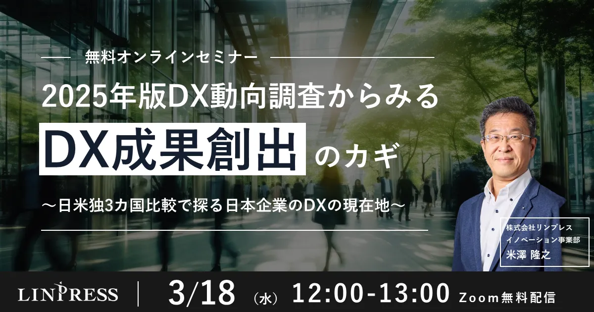企業がデジタルトランスフォーメーション(DX)を導入する中で、日本企業は非常に興味深い位置にいます。株式会社リンプレスは、2026年3月18日(水)12時より、特別なウェビナーを開催します。テーマは『2025年版DX動向調査からみるDX成果創出のカギ ~日米独3ヵ国比較で探る日本企業のDXの現在地~』です。このウェビナーでは、アメリカ、ドイツと日本のDX推進状況を比較しながら、日本企業の現状を明らかにしていきます。