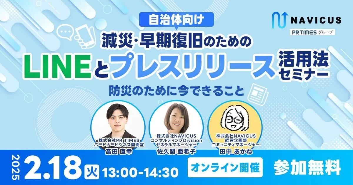 2025年2月18日(火)、弊社 NAVICUS と PR TIMES が共同で、自治体広報担当者や防災関連の責任者に向けた無料ウェビナー「減災・早期復旧のためのLINEとプレスリリース活用法セミナー」を開催します。このウェビナーは、特に防災への意識が高まる中、自治体がどのようにSNSとプレスリリースを効果的に活用できるかを学べる貴重な機会です。