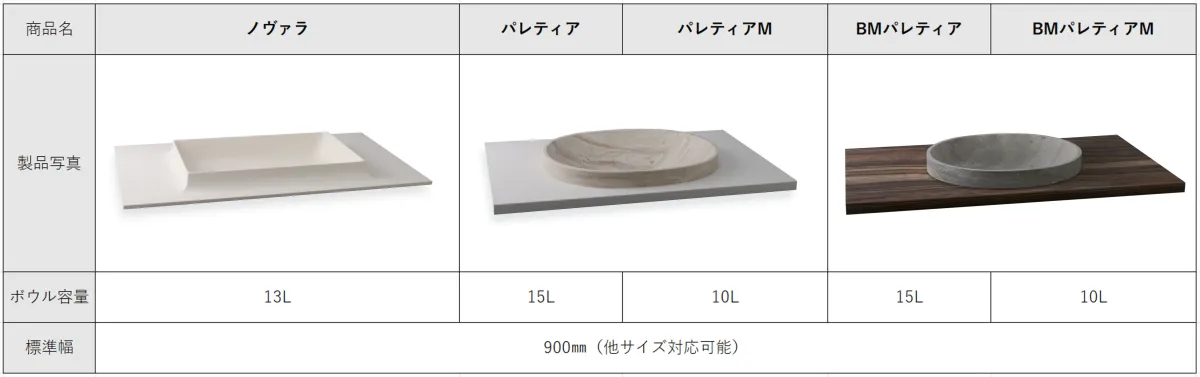 また、木目調の人工大理石「バイオマーブル®シリーズ」にも新たに2つの製品が登場しました。「BMパレティア」と「BMパレティアM」で、こちらも上記のボウルを組み合わせたものです。この組み合わせにより、リッチな空間を演出し、独特の温かさや洗練された雰囲気を洗面所に加えることができます。