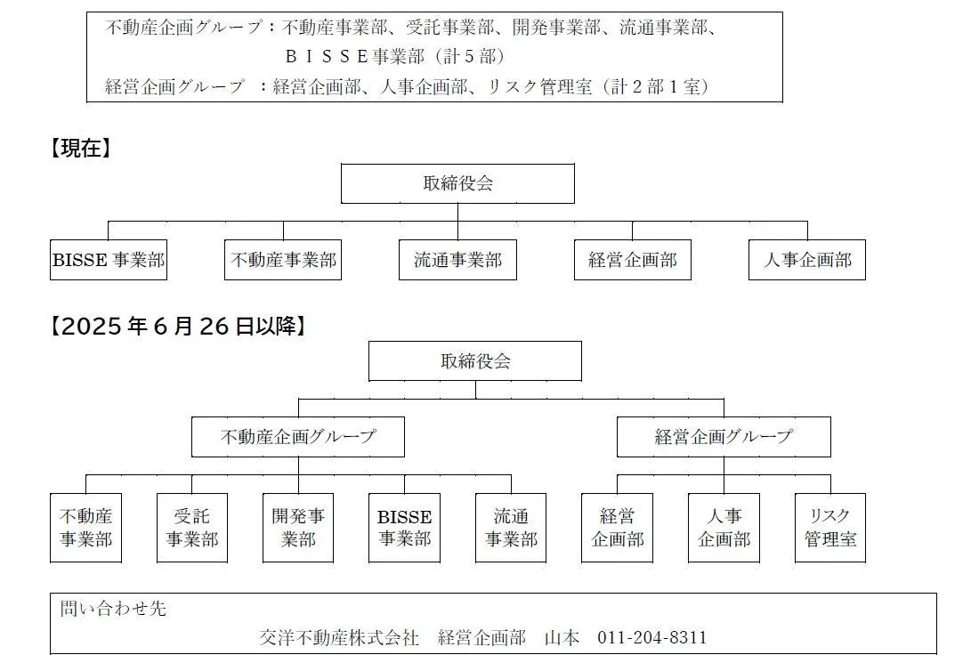 また、事業部は7部1室という形でグルーピングされ、より効率的な業務運営が実現される見込みです。具体的には、不動産企画グループと経営企画グループの2グループに編成され、役割が明確化されます。