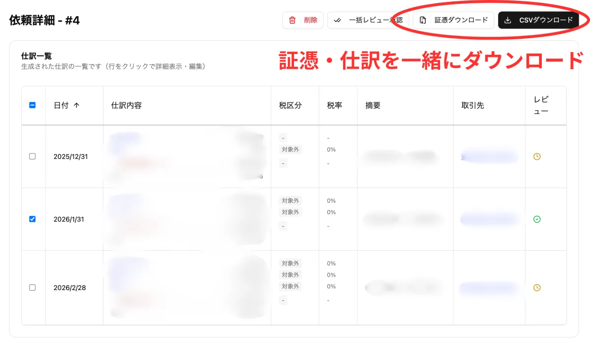 そして、会計事務所はこれらの証憑ファイルと仕訳をまとめてCSV形式でダウンロードすることができ、管理画面からの一括取得が実現します。これにより、効率的なデータ管理と業務のスピードアップが見込まれます。