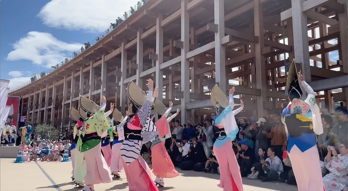大屋根リングの下、特設ステージを中心に設けられた舞台は、たくさんの観客を迎え、躍動感あふれる阿波おどりで盛り上がりました。各踊り子が色とりどりの衣装で女踊りや男踊りを披露し、その足元から響く太鼓の音が、まるで徳島の夏を再現しているかのようでした。