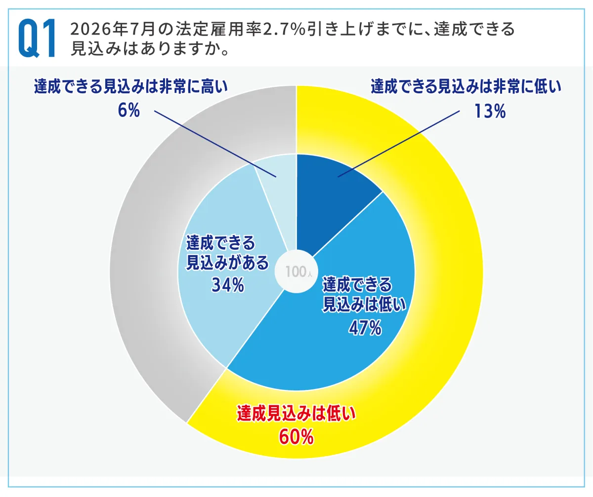 調査は2025年11月14日から11月17日の間に行われ、100名の担当者が回答しました。結果、法定雇用率の引き上げに不安を感じる企業が過半数を超えていることが確認され、特に「人材不足」と「採用ノウハウ不足」が同率で主な理由として挙げられました。