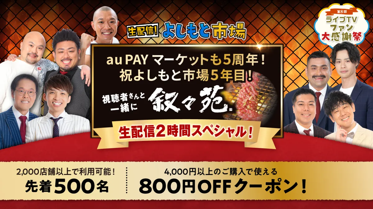 総合ショッピングサイト「au PAY マーケット」の人気ライブコマース番組「生配信!よしもと市場」が、2025年に5年目に突入します。これを記念して、特別な生配信イベントが6月26日に行われることが決まりました。