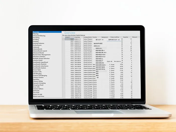 WPFやBlazor、ASP.NET MVC用エディションでは、特定の列をグリッドの左側だけでなく右側にも固定できるようになりました。これにより、情報の視認性が向上し、作業効率が大幅に改善されます。BlazorやASP.NET MVCエディションでは、従来の上側に加え、今後は下側の固定にも対応し、グリッドの柔軟なレイアウトが実現されます。