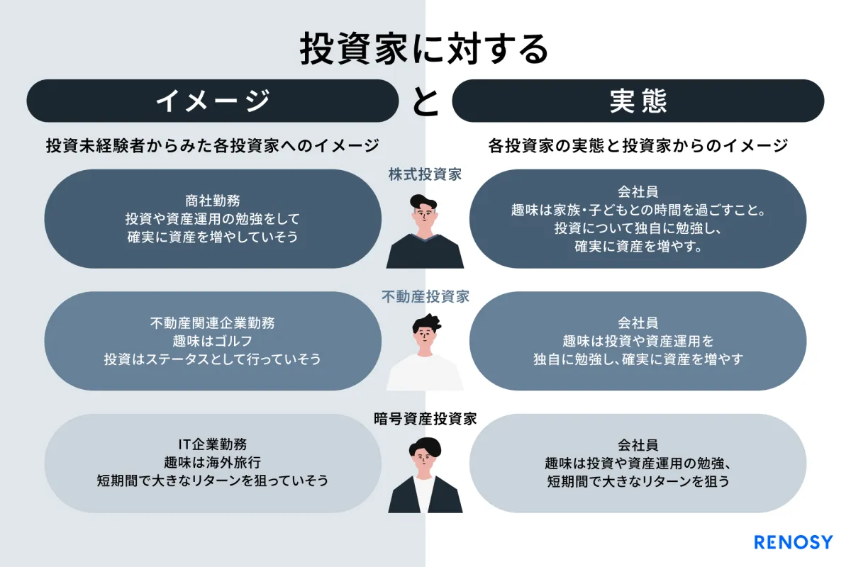 RENOSYが行った調査の中で、事前に「投資家のイメージ」と「実態」の乖離が明らかになったのは、非常に重要なポイントです。投資未経験者は、各タイプの投資家に対して特定のイメージを持っており、それが実態とは異なることが明示されました。