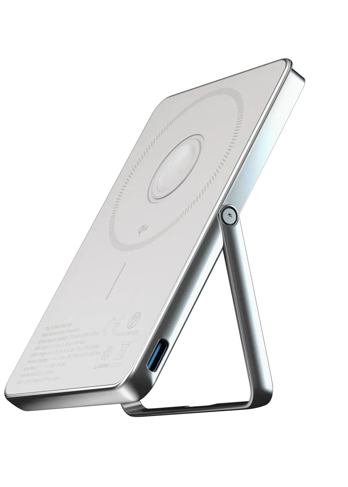 さらに、折りたたみスタンドも内蔵されており、スマートフォンを立てかけて動画視聴やWeb会議を行う際にも便利です。使用シーンに応じて角度の調整が可能なので、さまざまな場面で活用できます。また、最新のQi2規格に対応し、最大15Wのワイヤレス充電が可能です。これにより、iPhoneは従来の2倍の速度で充電でき、Androidデバイスもマグネット吸着で安定した充電が可能となっています。