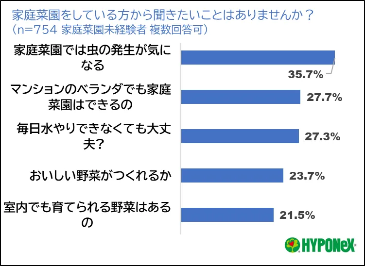 調査によると、家庭菜園に興味を持つ未経験者の35.7%が「虫の発生が気になる」と答え、そのほか「マンションのベランダでも可能なのか?」(27.7%)や「毎日水やりできる自信がない」(27.3%)といった意見が多数上がりました。特に日々の忙しさの中で家庭菜園を始めることに懸念を感じる方が多いようです。