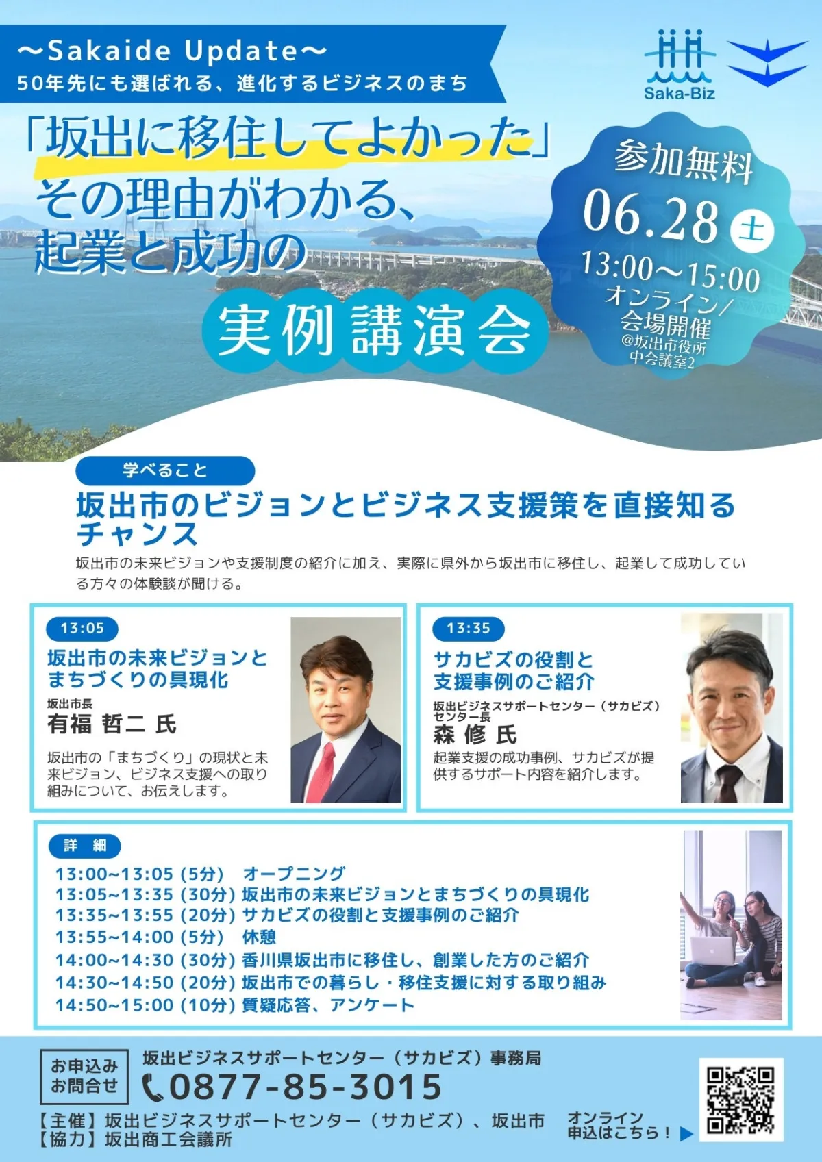 坂出市での移住や起業に興味がある方へ、ビジネスの成功事例をもとにしたセミナーが開催されます。この講演会では、坂出市の未来ビジョンや支援制度を紹介し、実際に移住して成功を収めた方々の体験を聞くことができます。