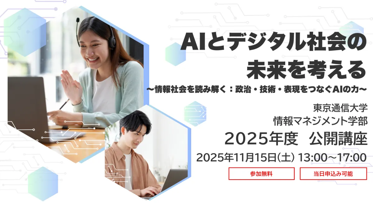 2025年11月15日(土)、東京通信大学の情報マネジメント学部では、誰でも無料で参加できる公開講座が開催されます。この講座は「AIとデジタル社会の未来を考える」というテーマのもと、オンラインで行われ、全国どこからでも、さらには海外からも参加可能です。これからの社会におけるデジタルとAIの影響について考える良い機会となることでしょう。