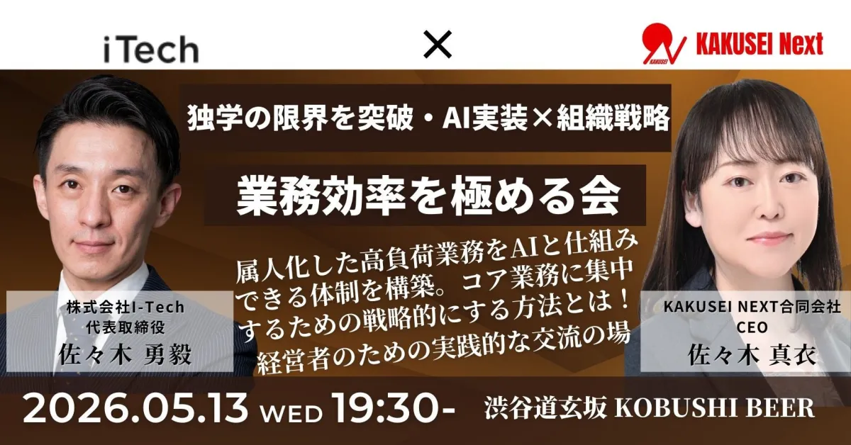 2026年5月13日、東京都渋谷区の『KOBUSHI BEER LOUNGE & BAR』で、「AI活用×組織戦略」に関する特別な交流会が開催されます。このイベントは士業や決裁者を対象に、業務効率を飛躍的に高める実践的な手法を共有するものです。主催は、I-Techの佐々木勇毅氏とKAKUSEI NEXTの佐々木真衣CEO、両者がコラボレーションし、A I導入に伴う共通の課題を解決するためのアプローチを提案します。