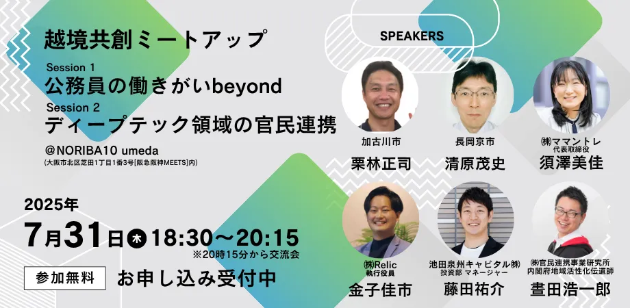 2025年7月31日、大阪市北区のNORIBA10 umedaで、株式会社Relicと官民連携事業研究所が共催する「越境共創ミートアップ」が開催される。このセミナーは、公務員と民間企業が官民連携の重要性について話し合い、今後の社会課題解決に向けた新たなアプローチを模索する場となる。