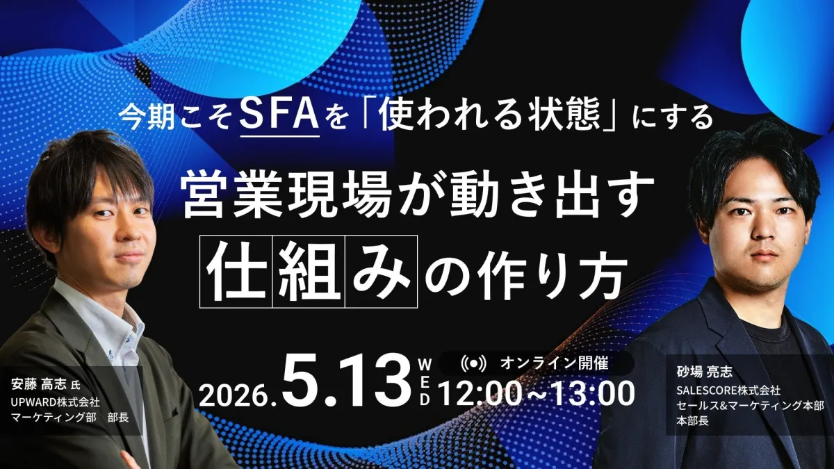 UPWARD株式会社とSALESCORE株式会社が共同で、オンラインセミナー「今期こそSFAを『使われる状態』にする 営業現場が動き出す仕組みの作り方」を開催します。このセミナーは、2026年5月13日(水)に実施され、営業現場におけるSFAの導入・活用の悩みを解消するための貴重な機会です。
