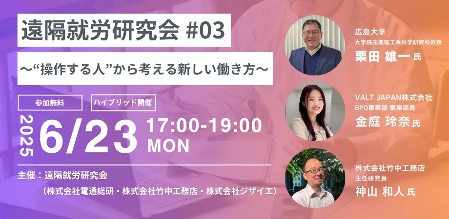 株式会社ジザイエ、電通総研、竹中工務店の三社が共催する「遠隔就労研究会」の第3回イベントが、2025年6月23日に東京都千代田区で開催されます。このイベントでは、現場を支えるオペレーターの視点から、遠隔就労の可能性や課題に焦点を当て、新たな働き方について議論が繰り広げられます。