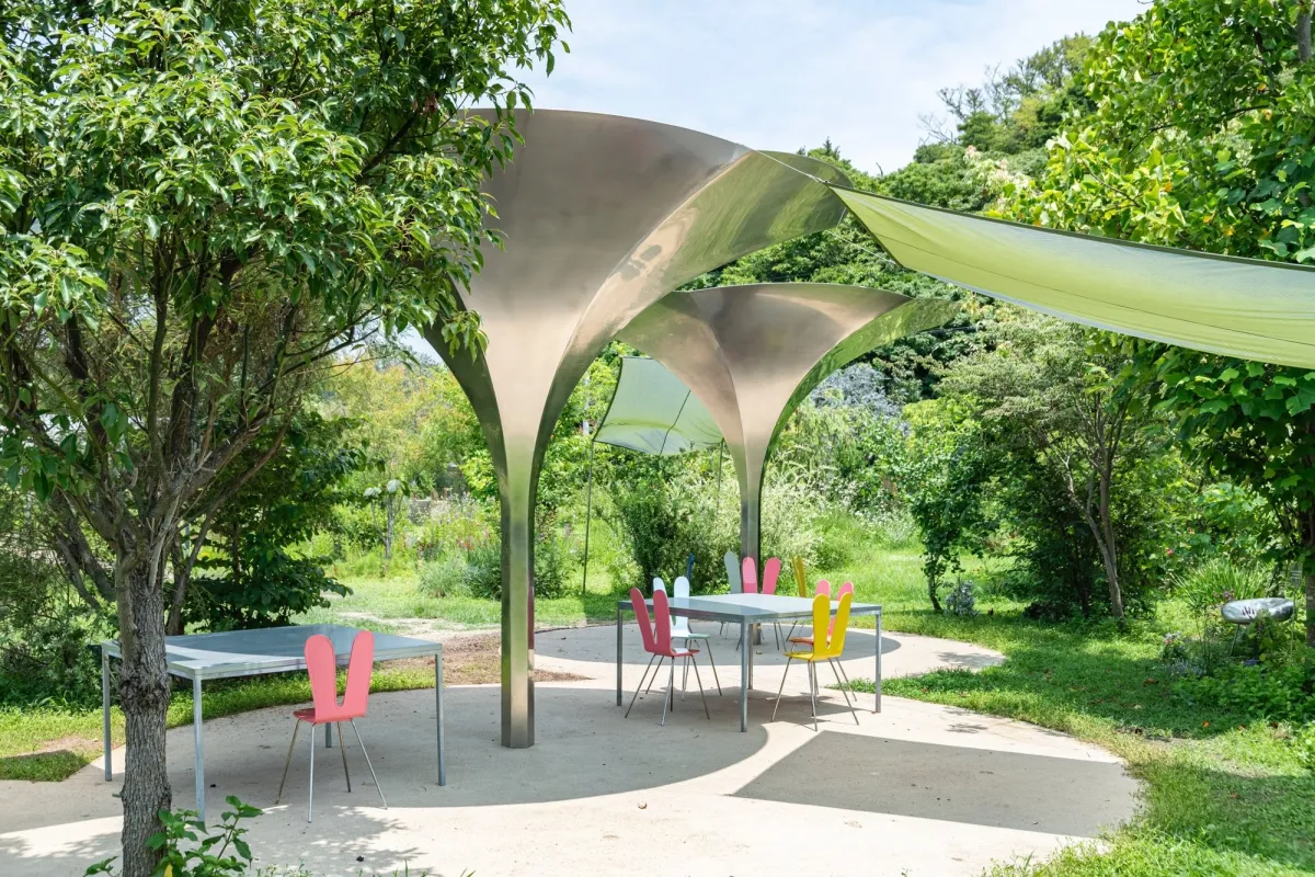 「犬島 くらしの植物園」の敷地内に位置する「HANA」は、自然と調和した軽やかな構造を特徴としており、まるで花が咲くような形状をしています。環境に優しいステンレス製の薄板を用いて鍛造され、周囲の自然を反映する美しいデザインとなっています。厚さわずか3mmのステンレスが、美しい鏡面仕上げで、日々変化する周囲の植物や夕日の光を映し出します。この設計は、島の住民や訪問者が集い、交流する新たなシンボルとなるでしょう。