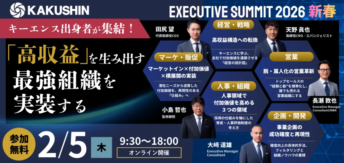 株式会社カクシンが主催する、オンラインウェビナー『KAKUSHIN EXECUTIVE SUMMIT 2026新春 高収益を生み出す最強組織のつくりかた』が、2026年2月5日(木)に開催されます。このイベントは、企業経営者や各部門のリーダー向けに、高収益化と組織革新の具体的な手法を学べる貴重な機会です。参加費は無料ですが、事前登録が必須となっています。