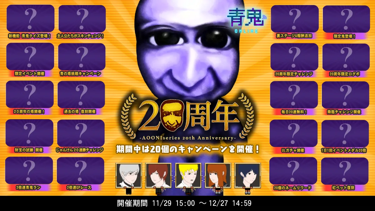 株式会社GOODROIDが提供する大人気のオンラインサバイバルゲーム『青鬼オンライン』が、青鬼シリーズの20周年を記念する特別イベントを2024年11月29日から12月27日までの期間限定で開催します。このイベントでは、豪華なキャンペーンが多数用意されており、ファンにとって見逃せない内容となっています。