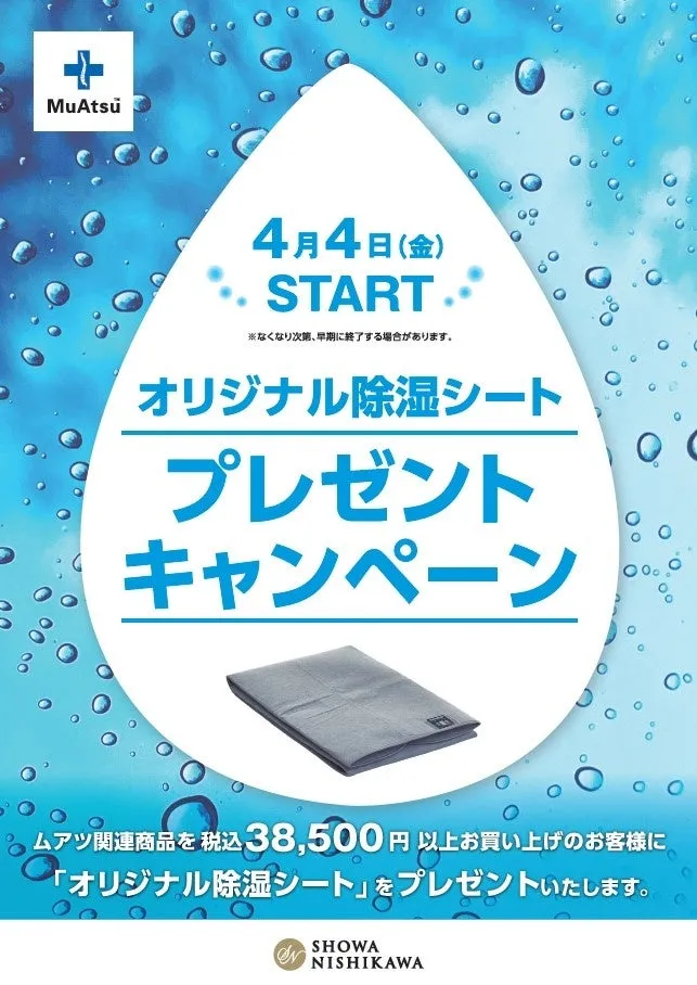 この特典は、2024年4月4日(金)からなくなり次第終了となります。ぜひこの機会にムアツマットレスを手に入れて、快適な睡眠環境を整えましょう。梅雨を快適に過ごすための心強い味方、オリジナル除湿シートを手に入れるチャンスをお見逃しなく!