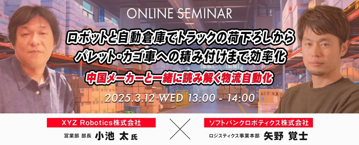 3月12日(水)、法人向けに特化したオンラインセミナー「ロボットと自動倉庫でトラックの荷下ろしからパレット・カゴ車への積み付けまで効率化」が開催されます。このセミナーは、ソフトバンクロボティクス株式会社とXYZ Robotics株式会社の共催で行われ、物流業界の現状や未来に迫る内容が盛り込まれています。