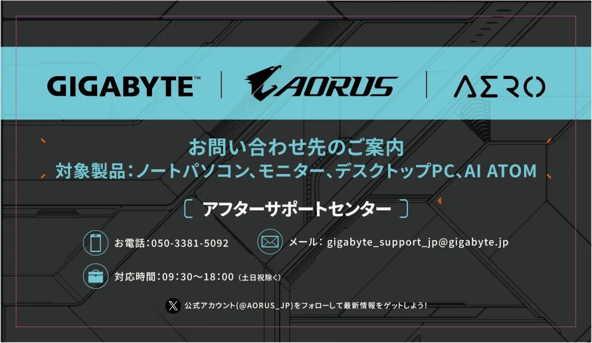 [email protected])や電話(050-3381-5092)での問い合わせが可能です。対応時間は平日9:30から18:00までで、土日祝は除かれます。また、公式サイト(https://www.aorus.com/ja-jpX)や公式SNSアカウント(@AORUS_JP)を通じても情報を得ることができます。