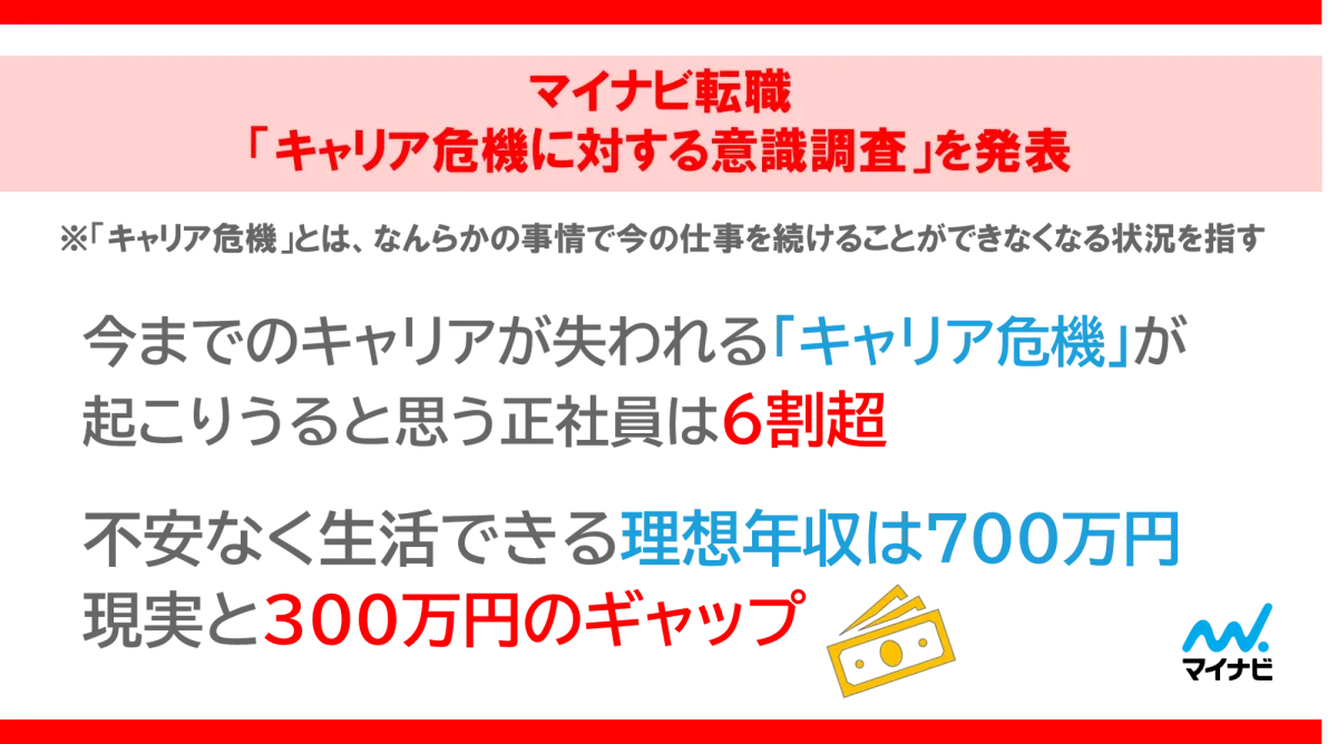 調査では、将来の安定した生活のために必要だと考える年収の中央値は700万円であるのに対し、実際の年収は中央値400万円という大きなギャップが示されています。このことから、現在抱えるキャリアに対する不安が浮き彫りになります。加えて、AIによる失業や企業の経営悪化といった新たなリスクも考慮されており、今後のキャリアについての不安要素が増えていることが伝わります。